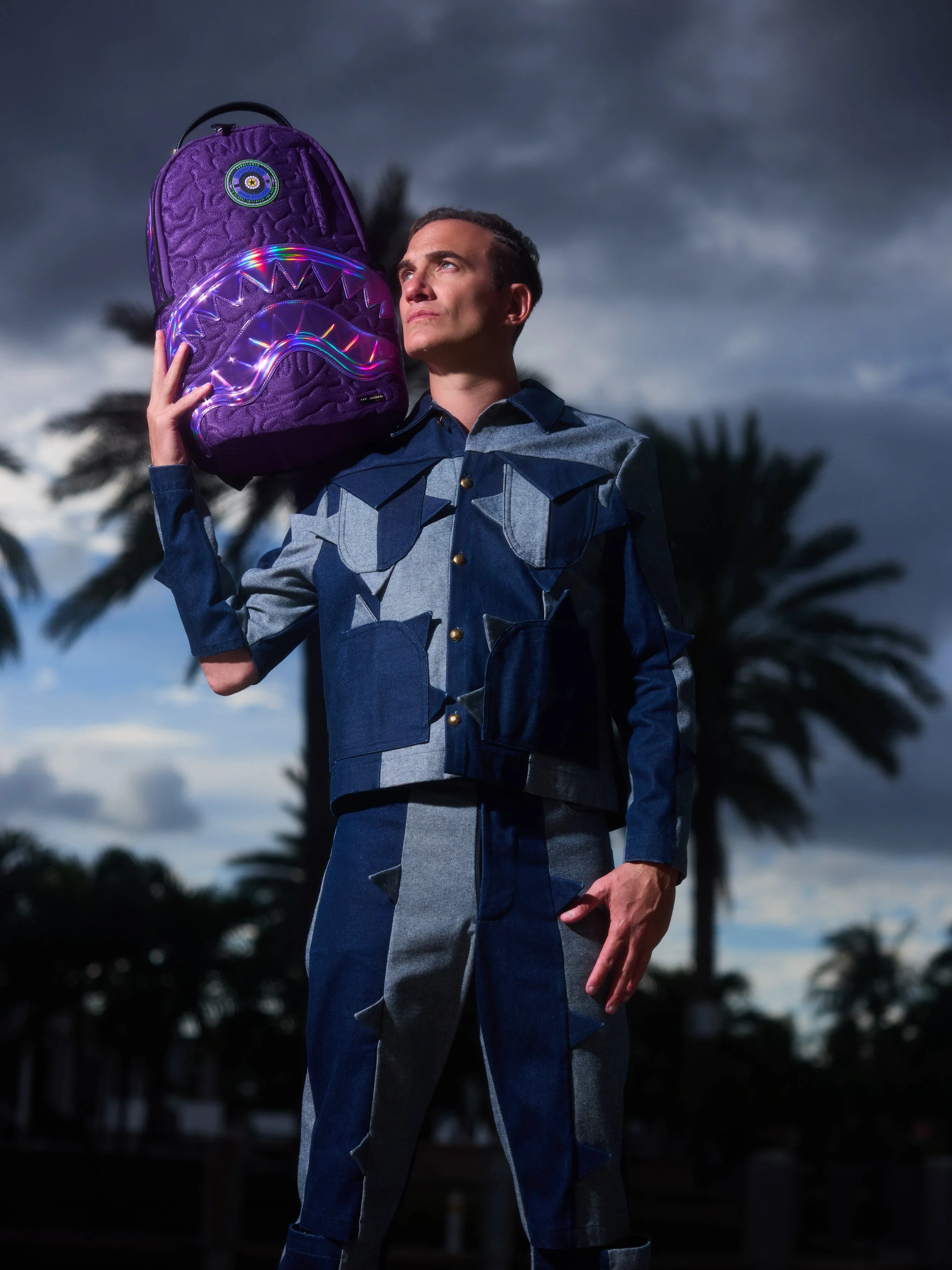 The A.I. African Intelligence collection features a backpack and crossbody bag detailed with sun-catching baby blue, deep pink, and silver rhinestones in a sharp, angular pattern, accented with wing-like extensions. As well as a futuristic deep purple backpack, finished with a soft, plush exterior defined by embroidered lines that add subtle dimension throughout and a light purple holographic shark mouth, Sprayground’s iconic symbol, and a circular patch highlights both the collection name and Sandflower.